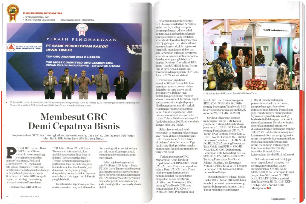 Implementasi GRC bisa meningkatkan performa usaha, daya saing, dan layanan pelanggan oleh Bank BPR Jatim Bank UMKM Jawa Timur. PT